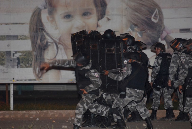 Policiais militares atiram com bombas de gás lacrimogênio e balas de borrachas durante vários confrontos que se espalharam pela cidade de Tailândia. Após apreensão madeireira de mais de 10000 metros cúbicos que deveriam ser levadas para Belém pelos fiscais da Sema que sairam da cidade após serem detidos por madeireiros.