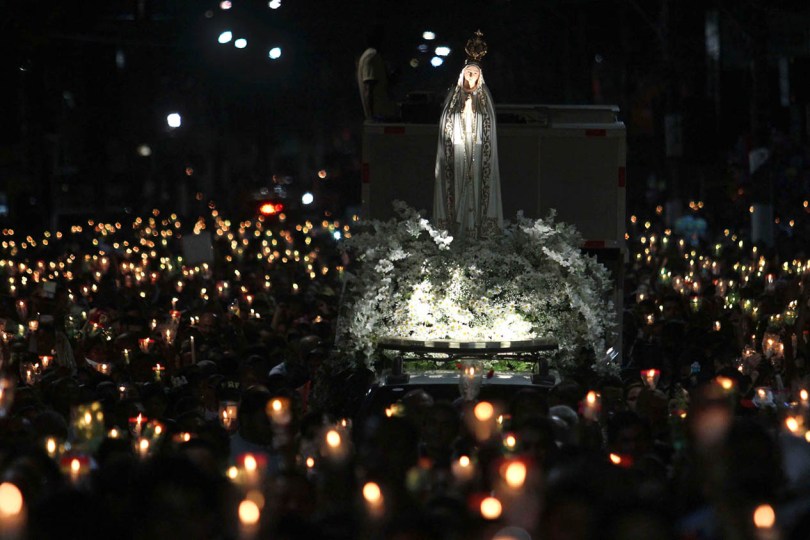 Milhares de devotos acompanham a procissão carregando velas durante o percurso.