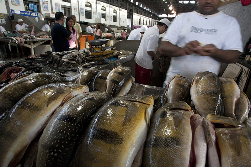 Carregadores peixeiros feirantes e clientes recebem o pescado vindo de rios e mar para comercialização interna e exportação.