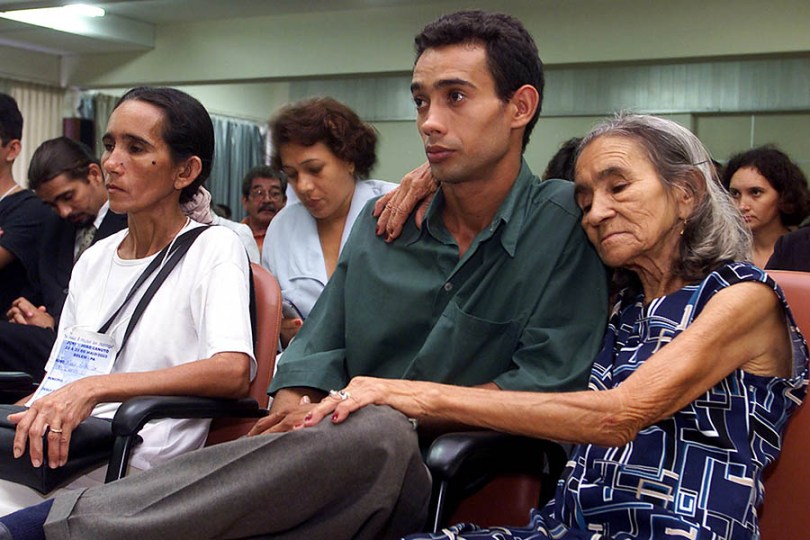 (esq. para dir.) Maria Aparecida de Oliveira Santos (filha), seu irmão Marcial Canuto de Oliveira e a viúva Geraldina Pereira de Oliveira , ao fundo a direita em segundo plano a filha Luzia Canuto, Durante o julgamento dos acusados do assassinato de João Canuto, presidente do sindicato dos trabalhadores rurais no sul do Pará em 18/12/1985 por conflitos de terrra.