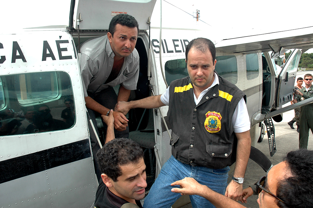Acusado de ser o mandante do assassinato da freira norte americana Dorothy Stang, Vitalmiro Bastos de Moura, o Bida, 34 anos, chega a base aérea de Belém, escoltados por policiais federais, após se entregar em Altamira a comissão do senado que investiga a morte da freira.