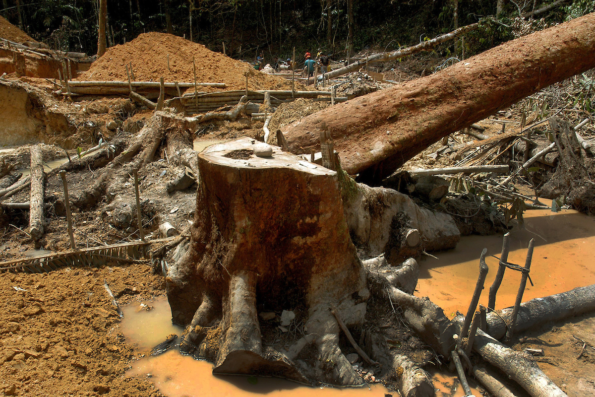 A cada dia garimpeiros ampliam as áreas a serem exploradas em busca de ouro e lentamente vão entrando na floresta derubando árvores e mudando o curso das águas dos igarapés..