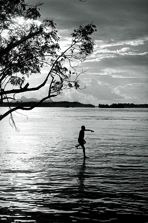 Criança Hupda brinca saltando de uma árvore no rio Negro.