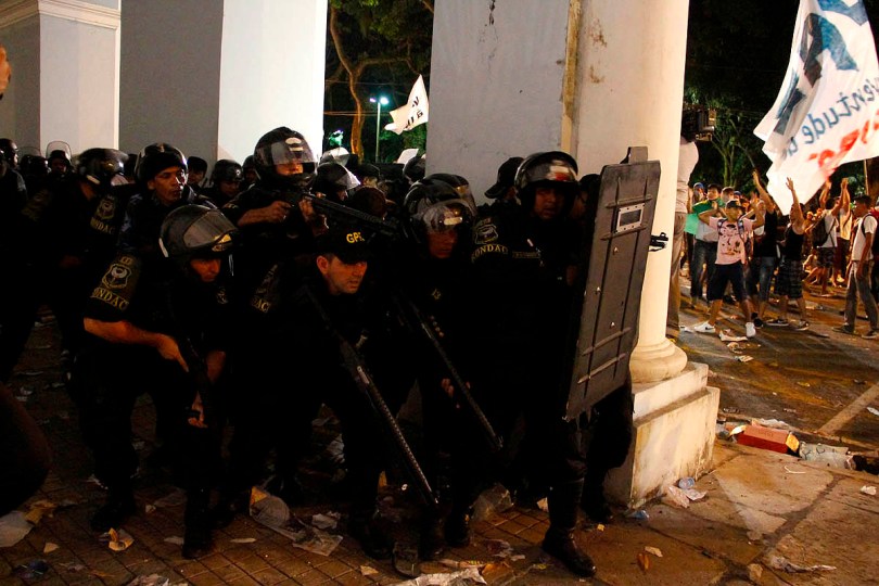 De acordo com a policia militar, cerca de 10.000 manifestantes participaram dos atos de protesto contra a corrupção, transporte em Belém e melhoria de vida. A passeata, que iniciou na praça de Nazaré, percorreu a cidade até a a sede da prefeitura onde ocorreram conflitos entre policiais militares, guarda municipal e manifestantes que jogaram pedras no prédio público e penduraram faixas e cartazes. Um guarda municipal foi ferido com uma pedra jogada por manifestantes que receberam balas de borracha e bombas de gás lacrimogênio.Belém, Pará, BRasilFoto Ney Marcondes20/06/2013