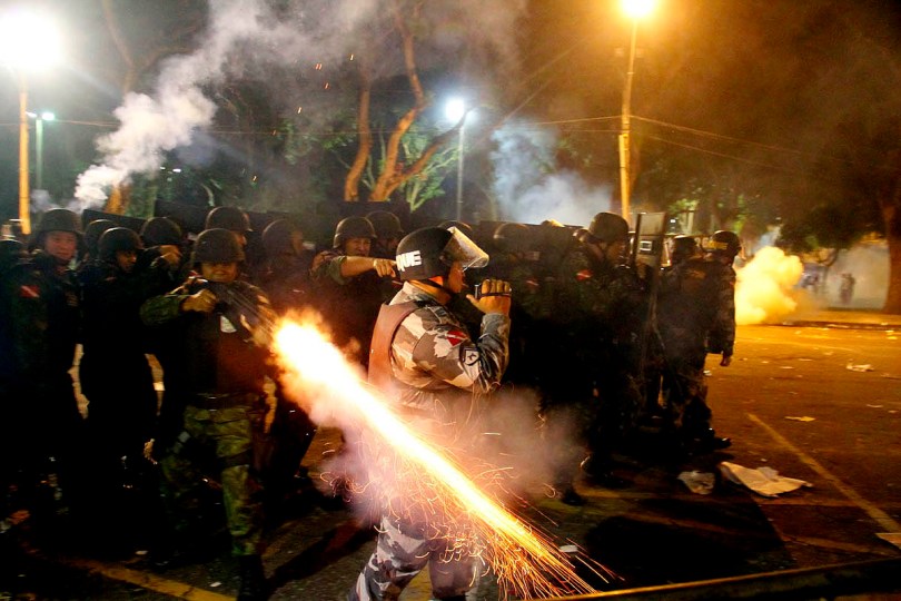 De acordo com a policia militar, cerca de 10.000 manifestantes participaram dos atos de protesto contra a corrupção, transporte em Belém e melhoria de vida. A passeata, que iniciou na praça de Nazaré, percorreu a cidade até a a sede da prefeitura onde ocorreram conflitos entre policiais militares, guarda municipal e manifestantes que jogaram pedras no prédio público e penduraram faixas e cartazes. Um guarda municipal foi ferido com uma pedra jogada por manifestantes que receberam balas de borracha e bombas de gás lacrimogênio.Belém, Pará, BRasilFoto Ney Marcondes20/06/2013
