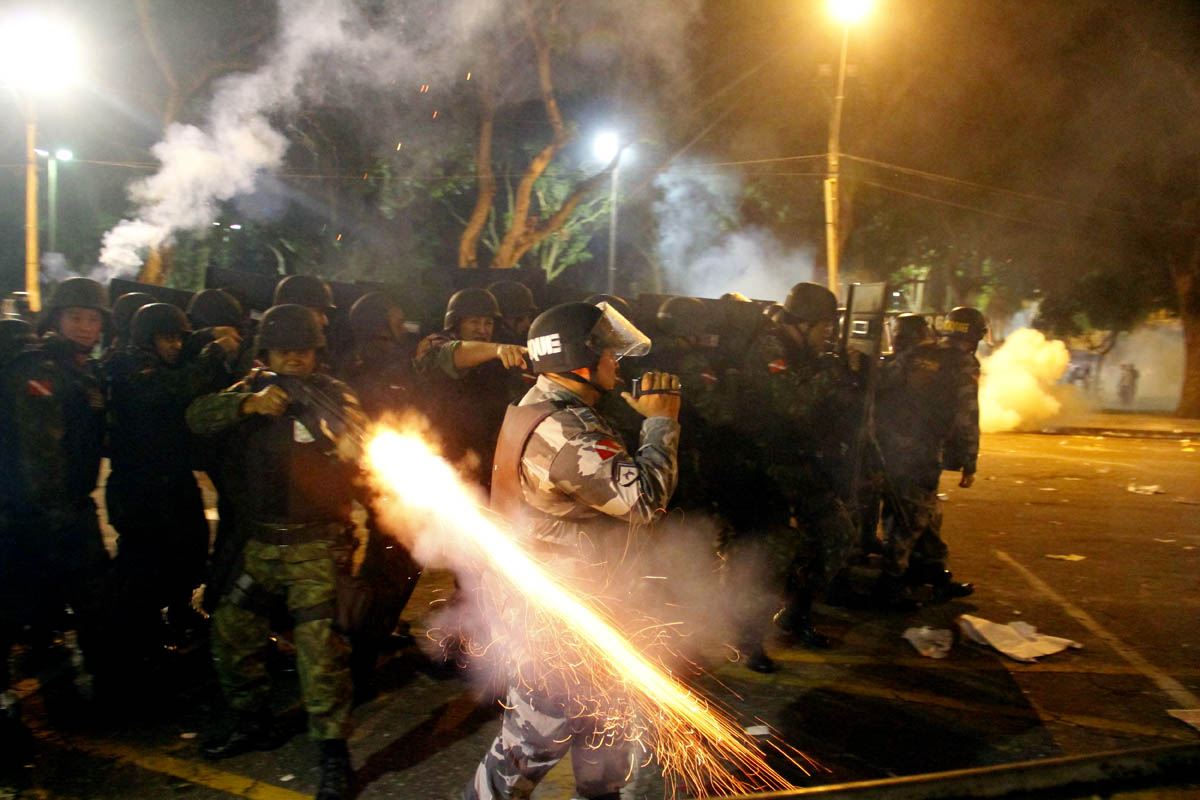 De acordo com a policia militar, cerca de 10.000 manifestantes participaram dos atos de protesto contra a corrupção, transporte em Belém e melhoria de vida. A passeata, que iniciou na praça de Nazaré, percorreu a cidade até a a sede da prefeitura onde ocorreram conflitos entre policiais militares, guarda municipal e manifestantes que jogaram pedras no prédio público e penduraram faixas e cartazes. Um guarda municipal foi ferido com uma pedra jogada por manifestantes que receberam balas de borracha e bombas de gás lacrimogênio.Belém, Pará, BRasilFoto Ney Marcondes20/06/2013