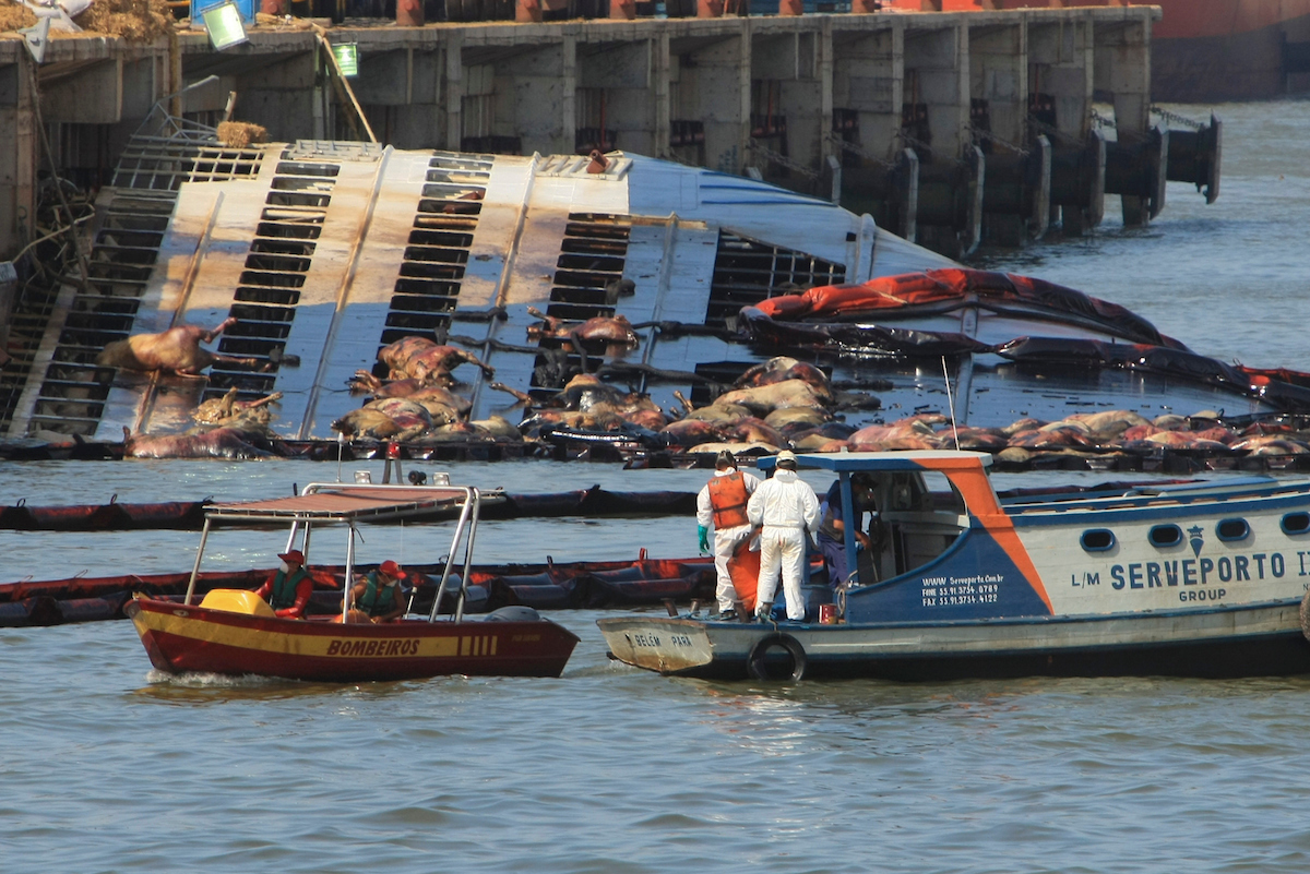 A operação de salvatagem iniciada no Porto de Vila do Conde teve início hoje fazendo a contenção dos animais mortos no naufrágio do navio Haidar no Pará. Até o momento se estima haver 4000 bois dentro do navio. O gado está em decomposição e há 750 toneladas de óleo na água.