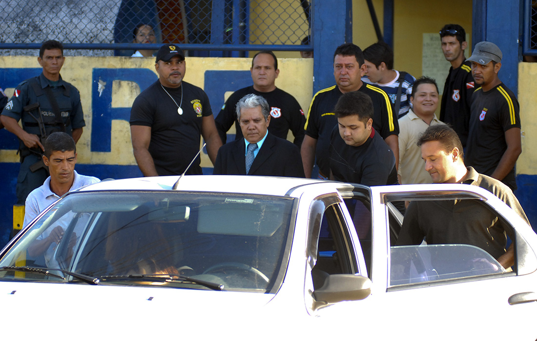 Clodoaldo Carlos Batista de camisa azul a esquerda(co autor) e Amair Feijoli da Cunha o Tato camisa marrom a direita(intermediário), ambos condenados respectivamente a 17 e 18 anos pela execução da missionária americana Dorothy Mae Stang, sairam às 8h deste sábado (9), do Centro de Recuperação do Coqueiro de carro. Eles foram beneficiados pela saída temporária para o dia dos pais. Os dois progrediram de regime em janeiro e fevereiro deste ano, por já terem cumprido o regime fechado, passando para o semi-aberto.Belém, Pará, Brasil.09/08/2008Foto Paulo Santos/Interfoto.