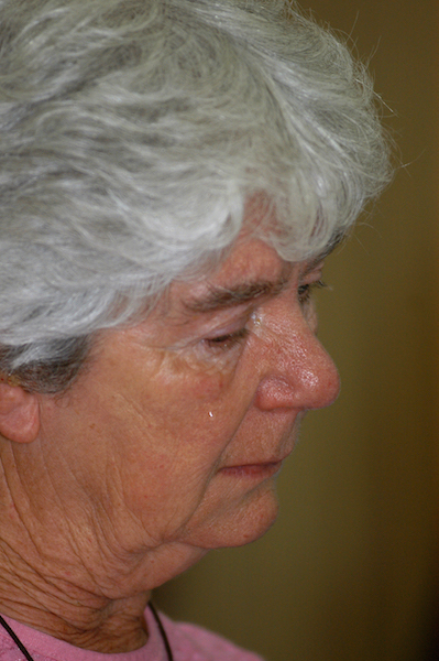 Emocionada após assistir o vídeo apresentado com a reconstituição do crime, Margaret Stang, irmã de Dorothy chora sendo confortada por seu irmão David e religiosas