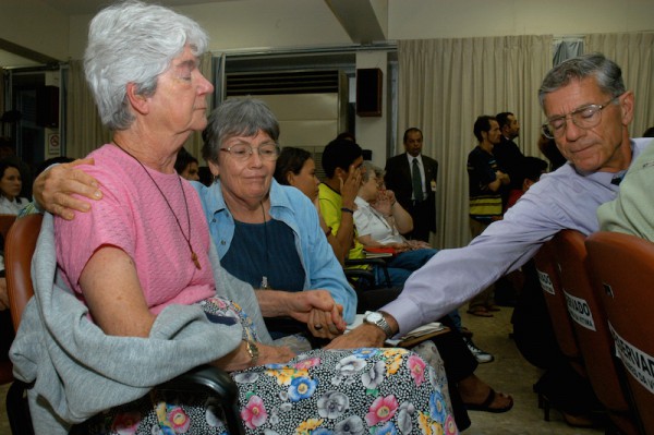Emocionada após assistir o vídeo apresentado com a reconstituição do crime, Margaret Stang, irmã de Dorothy chora sendo confortada por seu irmão David e religiosas