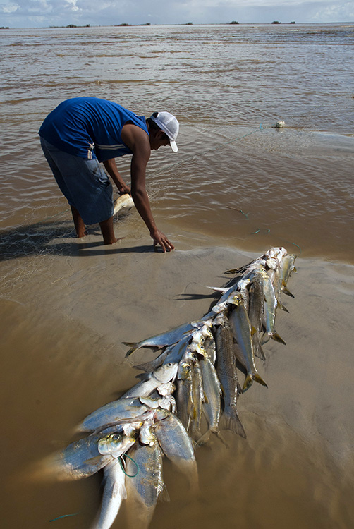 Pescadores retiram peixes da rede montada em um banco de areia a cerca de 3 km no litoral do Pará, na foz do rio Amazonas. Os pescadores chegam a capturar cerca de 200 quilos de pescado por dia entre: piramutabas, sardinhas, filhotes, pescada amarela, robalo e tainhas.