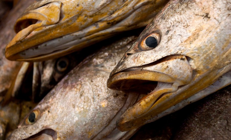 Peixes da espÈcie Corvina capturados no curral (armadinha fixa no solo e construÌda com varas e arames onde os peixes s„o aprisionados na preamar e removidos na marÈ vazante) s„o organizados, apÛs a despesca, para o transporte atÈ a embarcaÁ„o. A pesca È realizada nas proximidades da praia de Paxic˙ na Reserva Extrativista Marinha M„e Grande localizada no litoral do Par·, na foz do rio Amazonas.