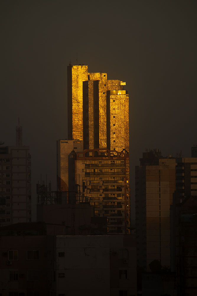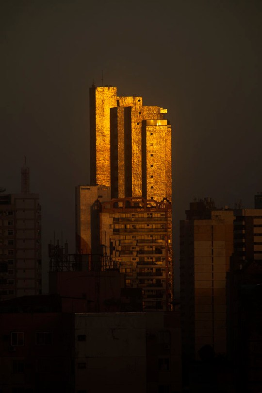 Luzes do amanhecer refletem nos prédios da Cremação.