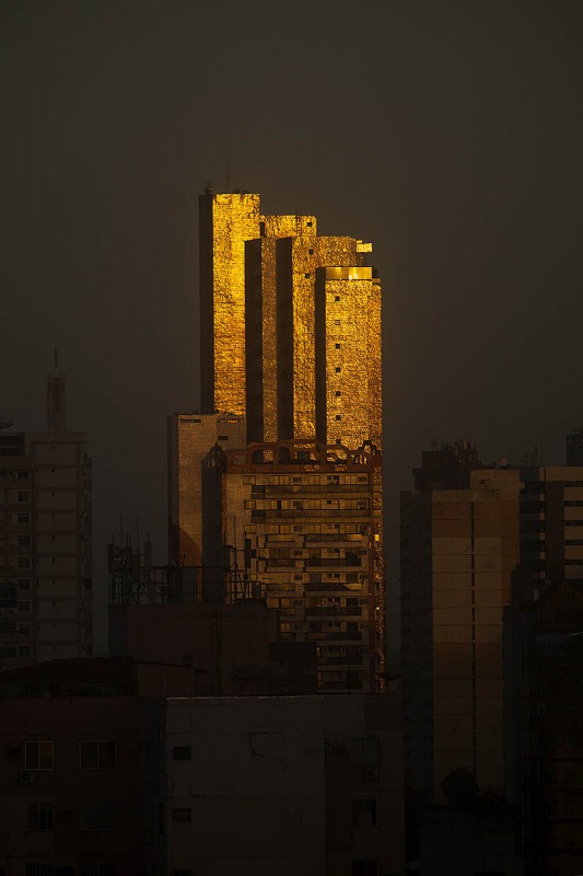 Luzes do amanhecer refletem nos prédios da Cremação.