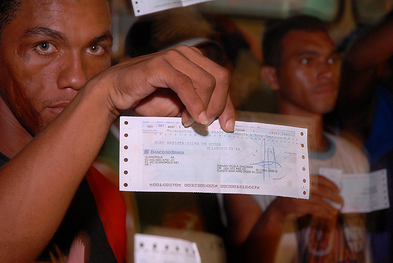 Trabalhadores mostram aos jornalistas a indenização paga pela Pagrisa, empresa do setor sucroalcooleiro do Pará, autuada pelo grupo móvel do Ministério do Trabalho durante operação de combate ao trabalho escravo.